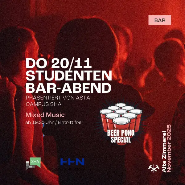 Am Donnerstag, den 20. November, startet der Studenten-Barabend in der Alten Zimmerei! Das Beer Pong Special startet ab 19:30 Uhr – sponsored by ASTA! 🍻 All Night Long: Bier für 3 €, Shots für 2 €, eine vergünstigte Getränkekarte mit Studi-Preisen. Eintritt frei! 🥂 Specials: 🏓 Bier Pong🍹 Studi-Preise: Vergünstigte Getränkekarte👉 Eintritt frei!____ Infos:🗓️ Donnerstag […]
