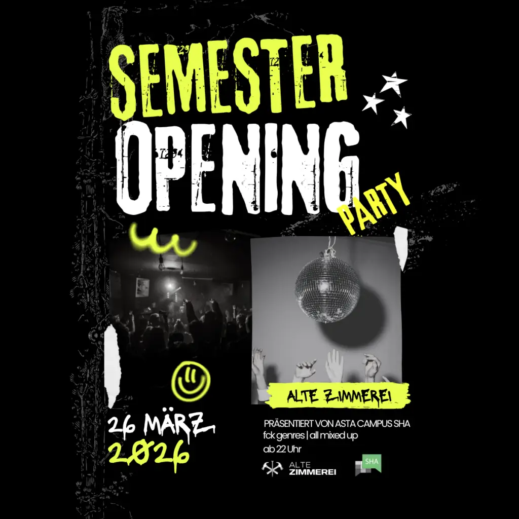 Semesterbeginn? Wir machen’s offiziell! Am Donnerstag, 26. März ab 22 Uhr feiern wir gemeinsam den Start ins neue Semester in der Alten Zimmerei. Freut euch auf eine Nacht voller Beats, Drinks und guter Vibes.🎉 Specials: 🥃 Shots 2€ 🍻 Bier 3€ 🍹 Studi-Preise: Vergünstigte Getränkekarte 👉 Vergünstigter Eintritt für Studenten -> bitte bringt euren Studentenausweis […]