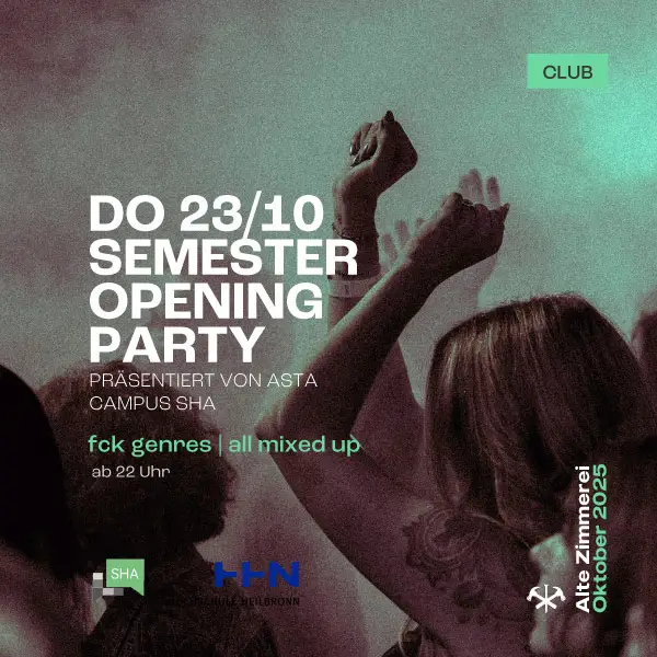 Am Donnerstag, den 23. Oktober, feiern wir die Semester Opening Party in der Alten Zimmerei.